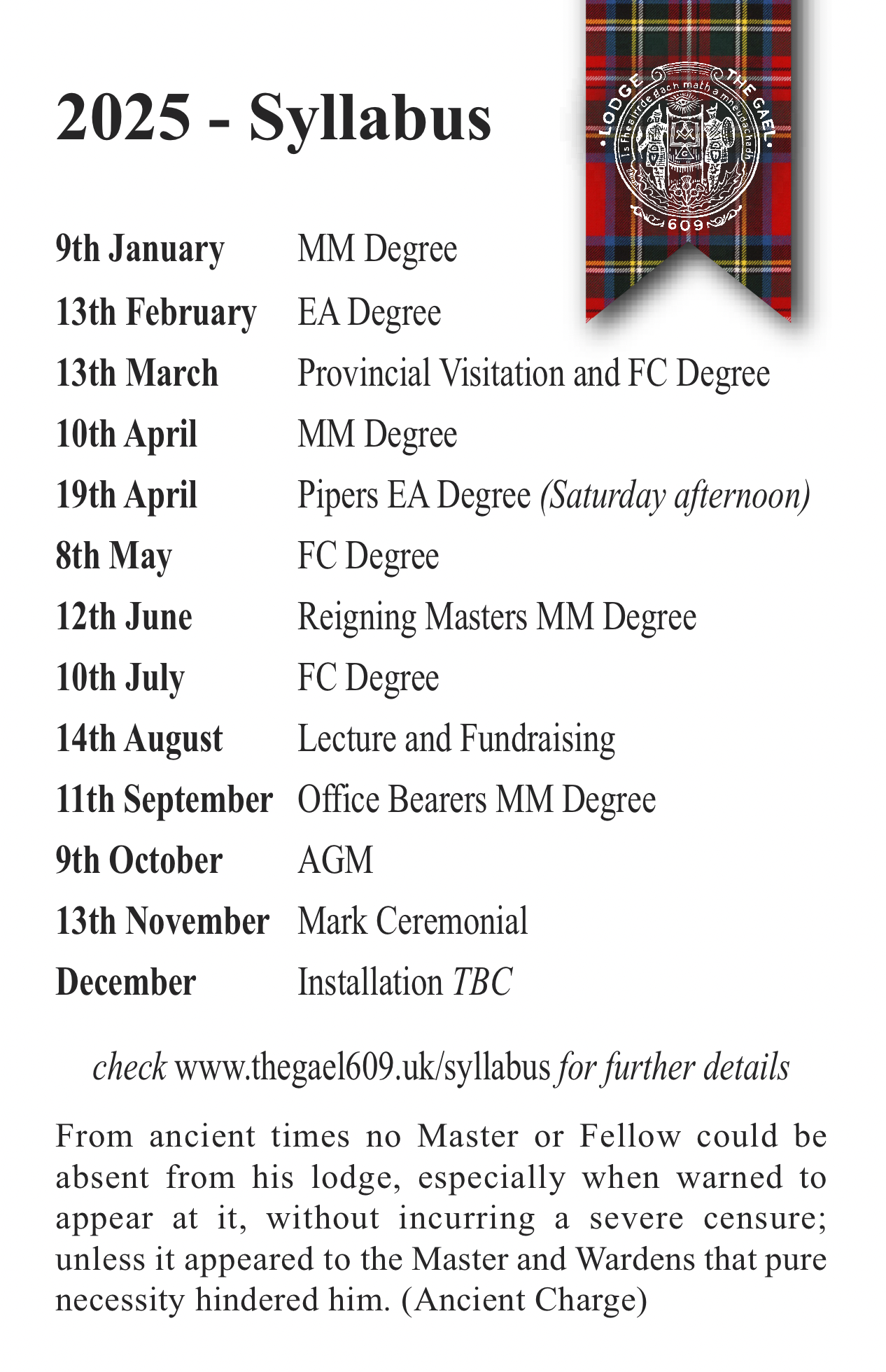 Please note our meeting scheduled for Thursday 10th April has now been changed to Wednesday 9th April when Lodge Inchinnan 1405 will visit to confer a MM Degree.