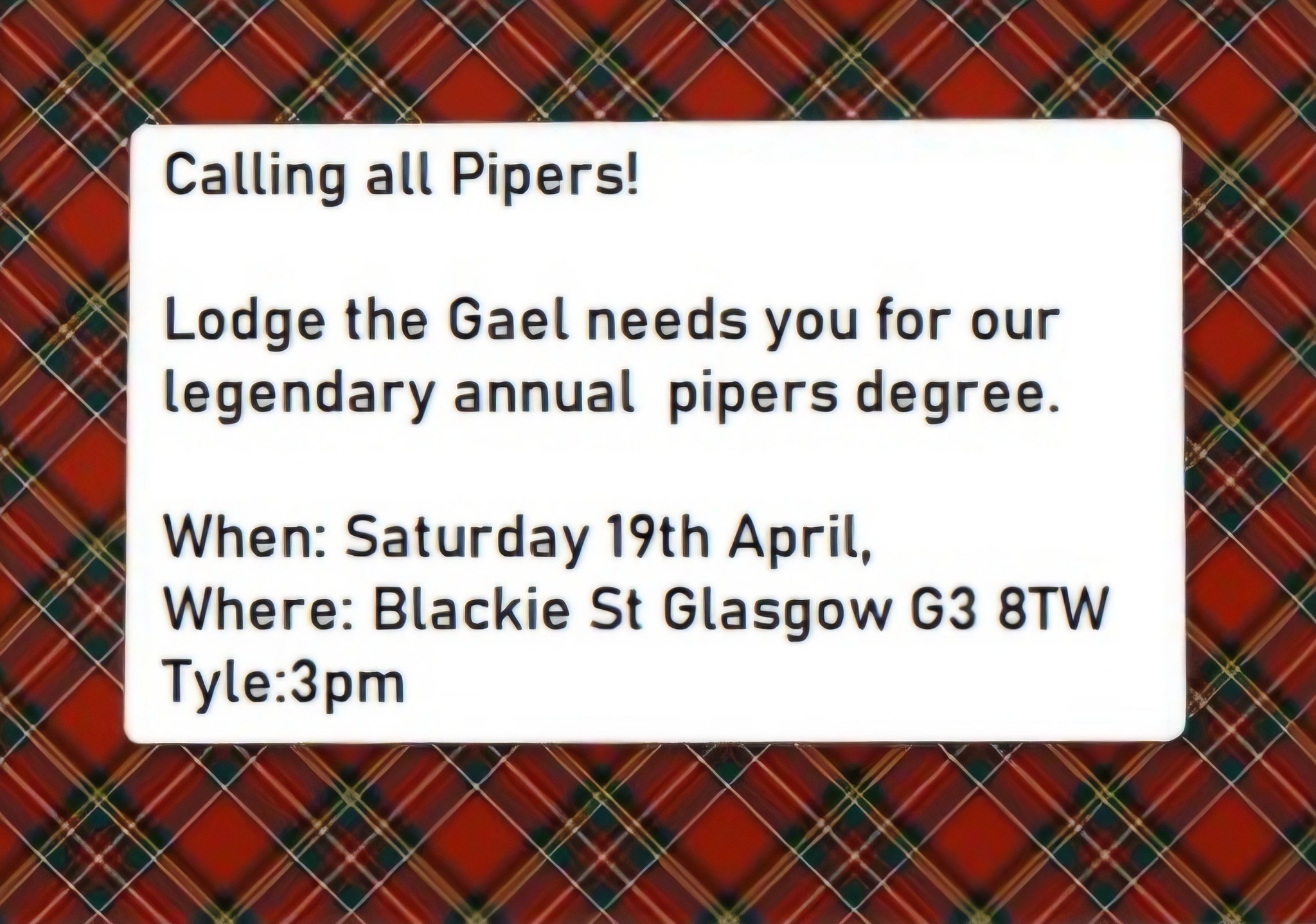 We are delighted to confirm our Pipers Degree for 2025 will be Saturday 19th April